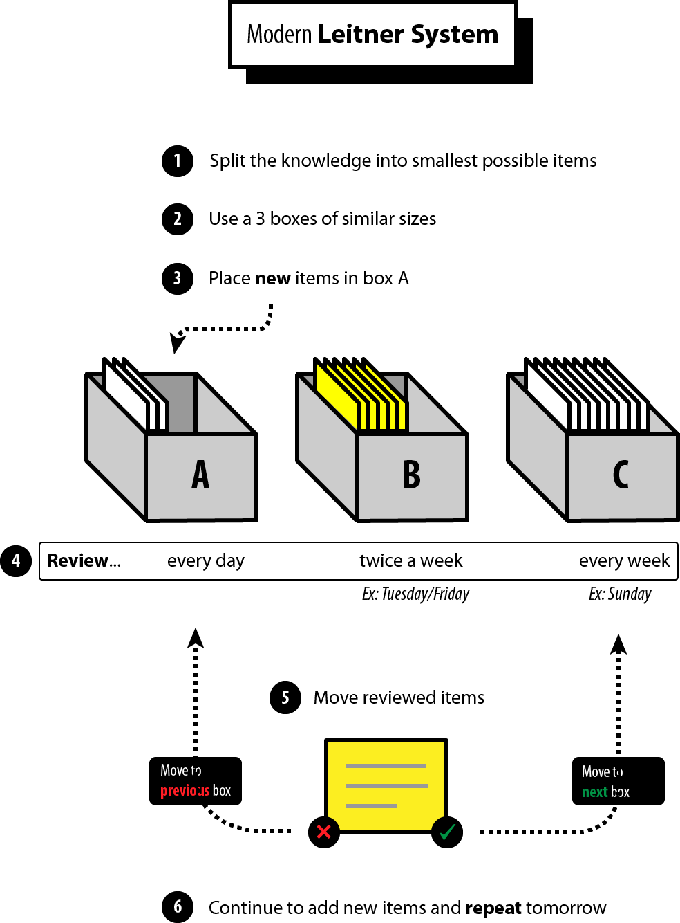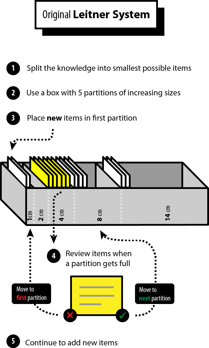 If Hermann Ebbinghaus is credited for the initial research behind SRS, the Leiter System is often quoted as the first algorithm. This system uses a physical box as depicted by the following illustration:
