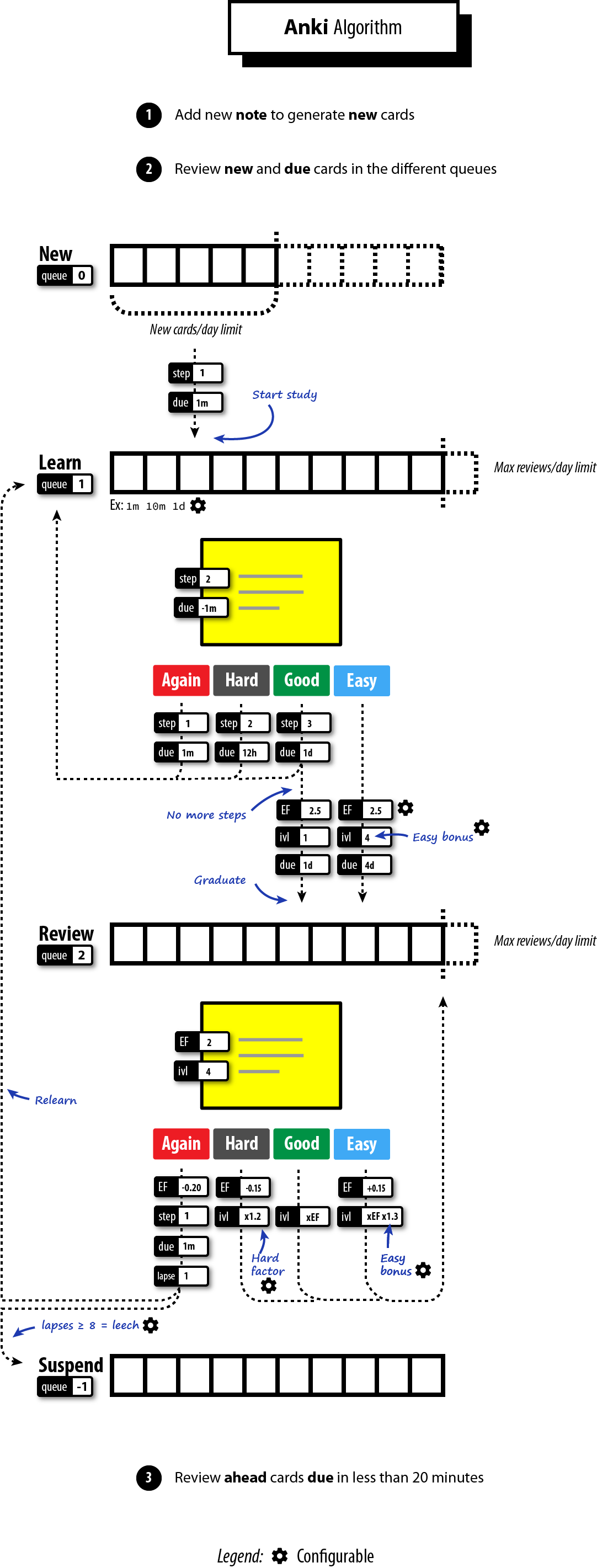 2 | Learning cards are rescheduled in the sub-day queue 1 when the next review is planned before the end of the day review session. The due date is the number of seconds until the next review. Otherwise, the card is rescheduled in the day learning queue 3 and the delay is the number of days until the next review. |