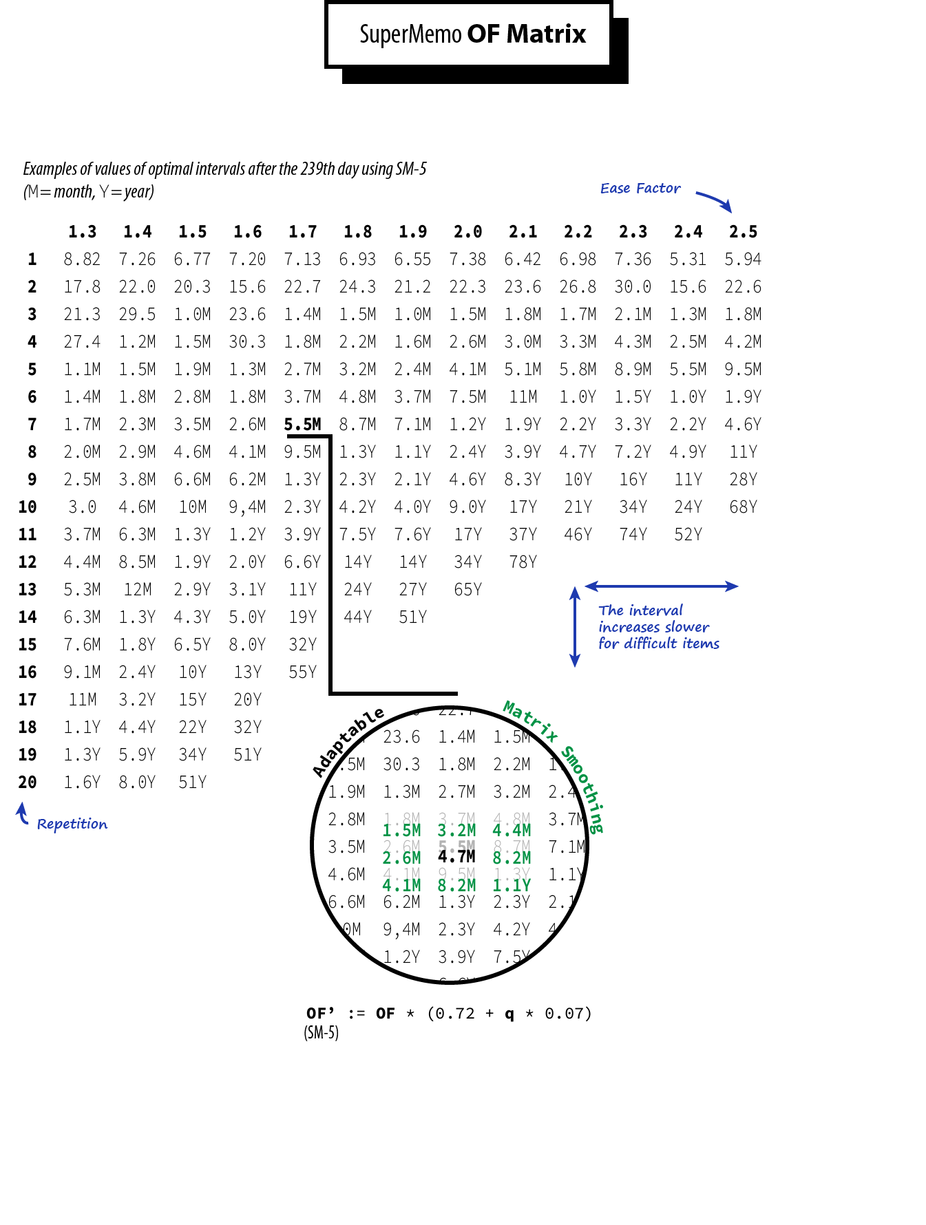 A two-dimensional matrix is easier to represent but the logic is similar with more dimensions. Initially, the matrix was defined based on prior measurements in SuperMemo. After each answer, the grade tells SuperMemo how well the interval "performed." If the grade is low, the interval was too long. If the grade is high, the interval was too short. The entry in the matrix is updated in consequence and matrix smoothing is applied (= if a value increases, a smaller increase can be beneficial to neighbors too).