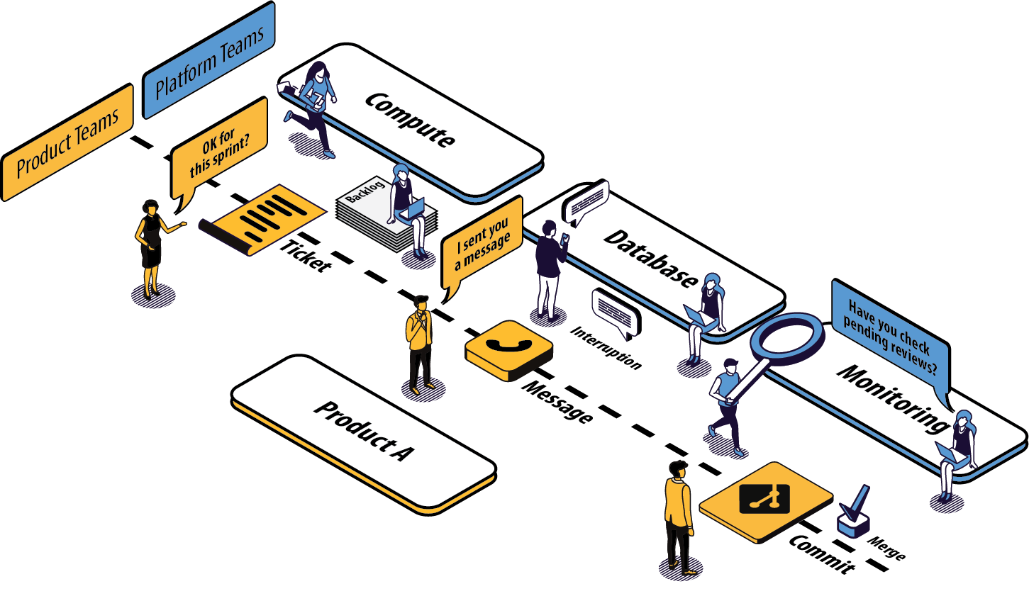 To illustrate the previous leverage points, we can reuse the example where product teams were initially interacting with platform teams directly.