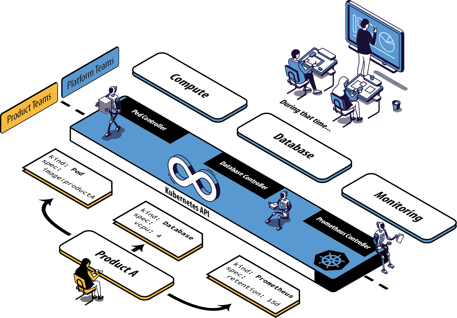 Let’s take for example Kubernetes. Kubernetes comes with an API for product teams to run their code packaged as containers. In addition, Kubernetes is extensible and makes it easy to create new controllers to manage new kinds of resources. (A Kubernetes controller is basically a container that watches changes in Kubernetes resources to start new containers on the behalf of the users.) For example, a product team can create a new resource of type Prometheus