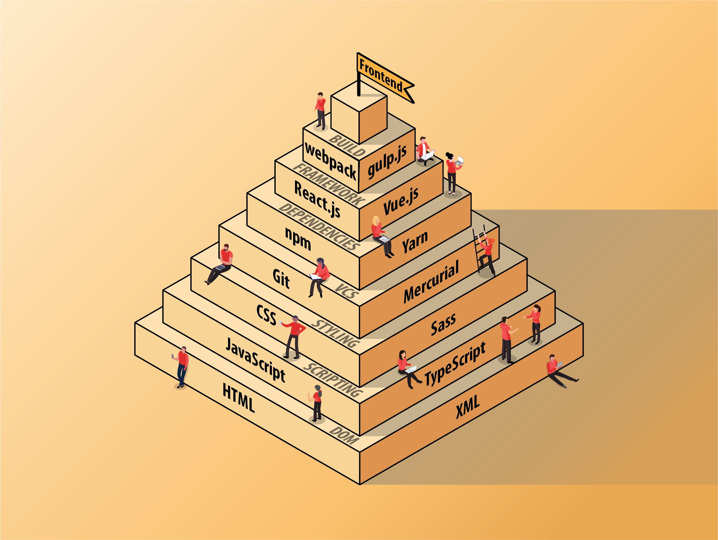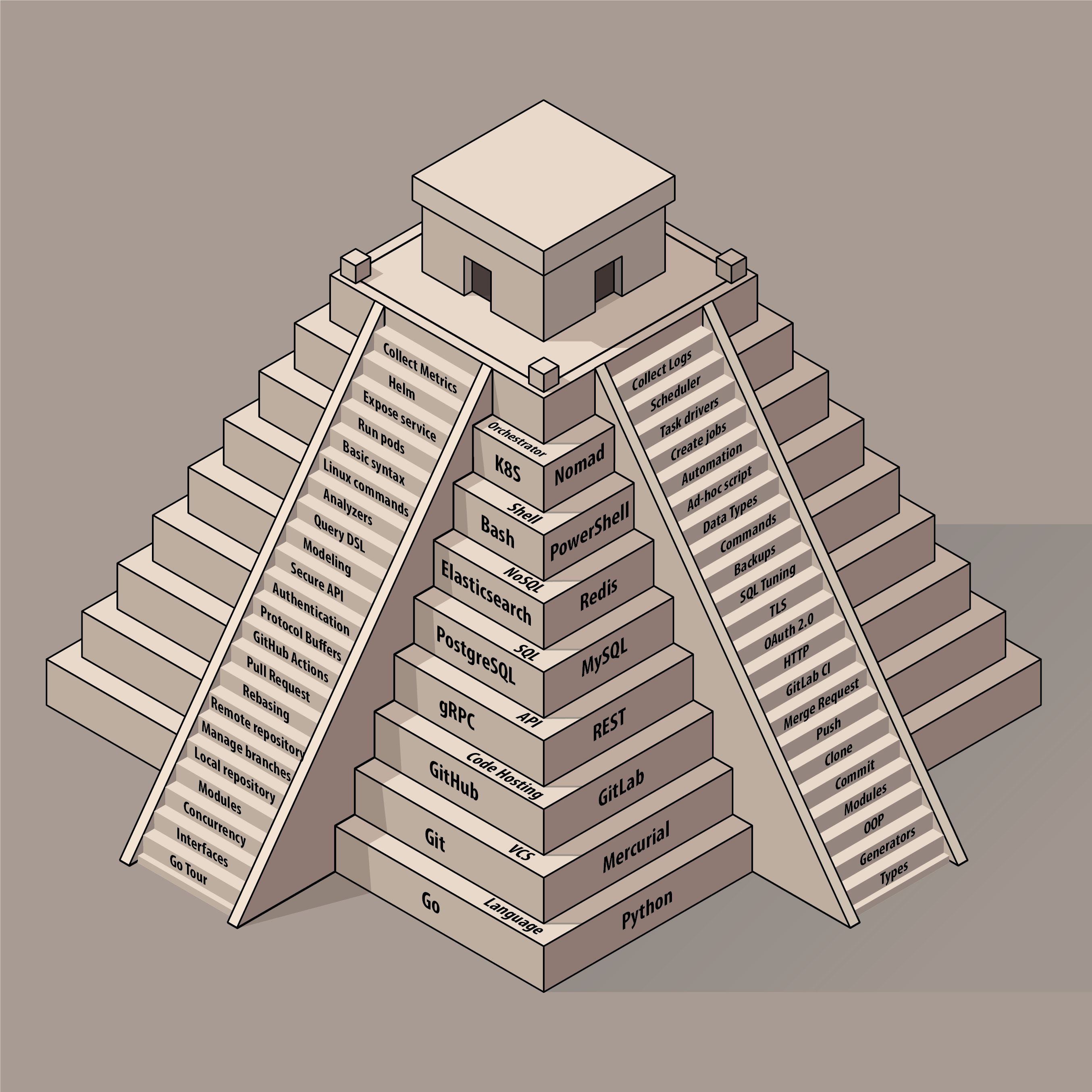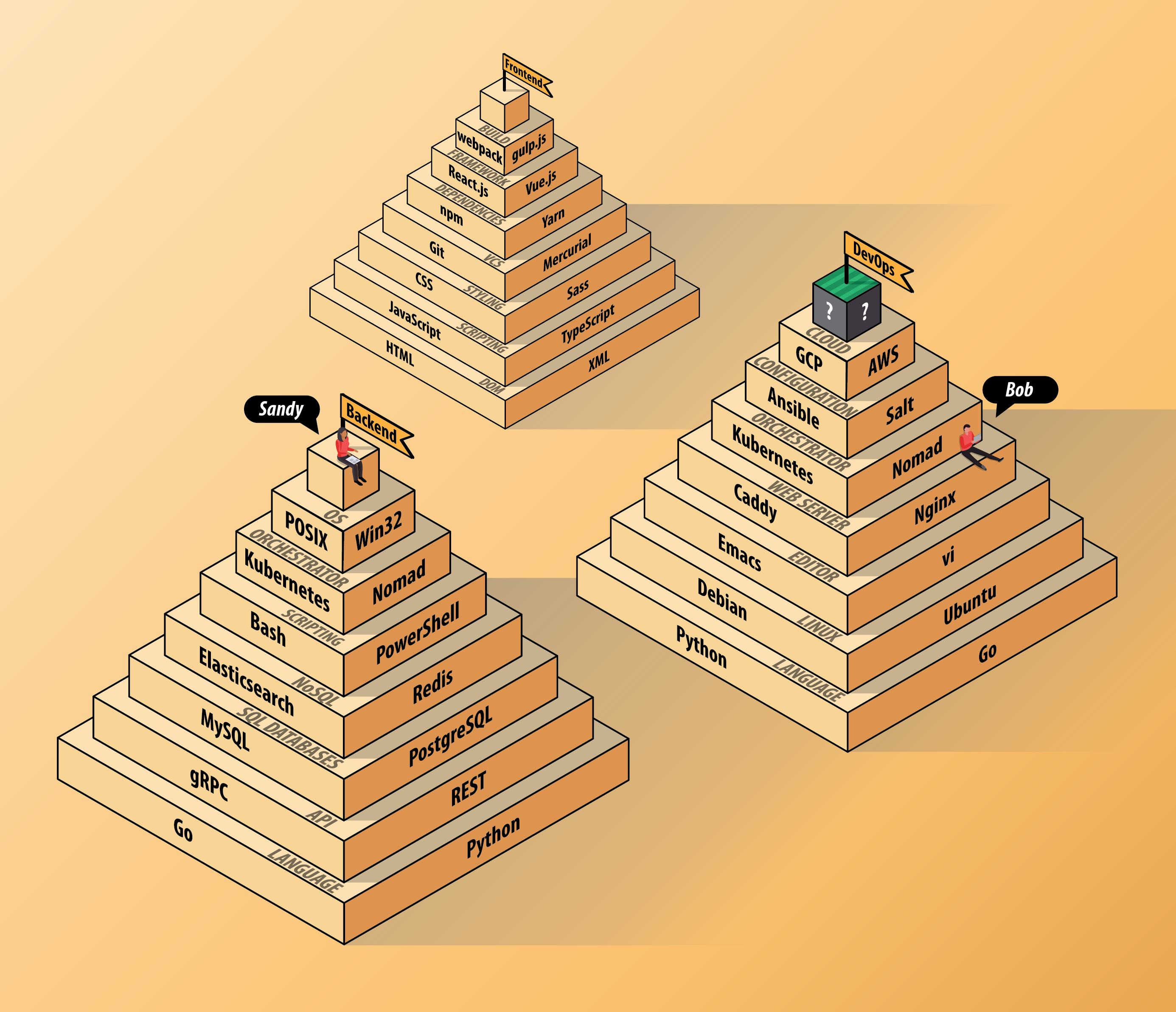 Observe the pyramids in the following illustration: These pyramids depict possible roadmaps to reach expertise on various aspects of software development. I will use two imaginary developers climbing those pyramids to illustrate my point.